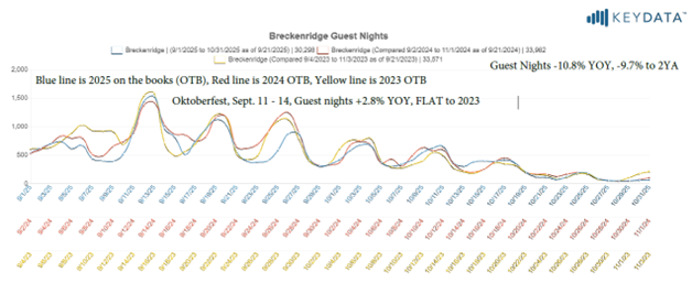 The Oktoberfest nights of Sept 11 – 14 were +2.8% YOY and +0.5% to 2YA. September nights on the books are -18% YOY and -25% to 2YA. Demand for October was solid during the Sept 8 to 21 booking period. Guest nights filled for October stays exceeded last year by 22% and outpaced 2023 by 4%. October guest nights on the books are -4% to each of the past two years. Oct 11-14 could offer a small bump in visitation as 56% of schools have a mini break on these dates.