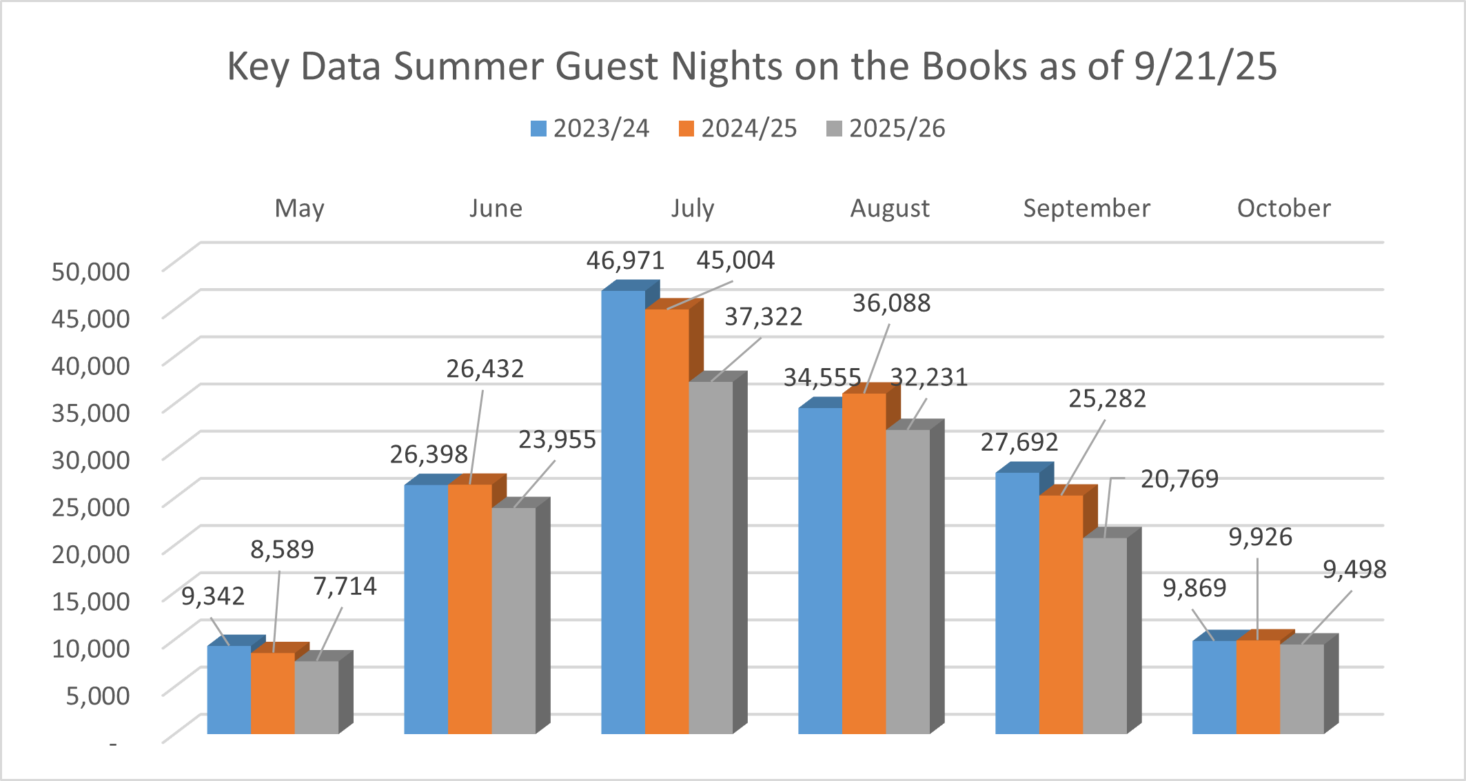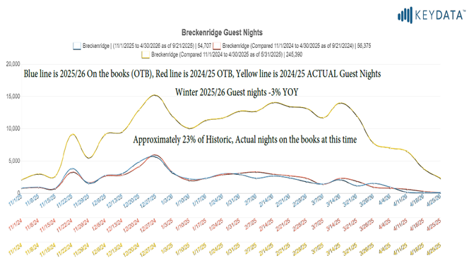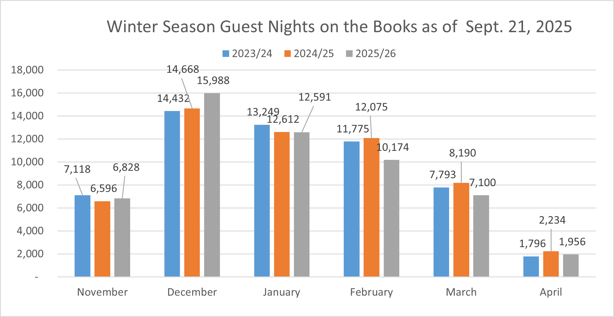 Winter Season 2025/26 guest nights on the books are – 3% to each of the past two years. November and December are pacing ahead of last year. January through April are all down YOY.