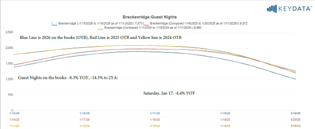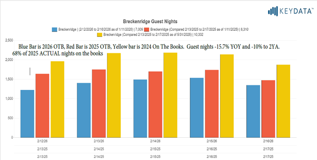 President’s Weekend (February 12 to Feb 16) has 15.7% fewer guest nights on the books than 2025. Breckenridge has booked approximately 68% of last year’s actual guest nights. Last year, on this date, Breckenridge had 80% of 2025 actual nights on the books. The graph below has 2 years of guest nights on the books plus last year’s actual guest nights on the books.