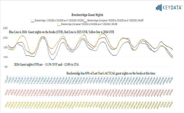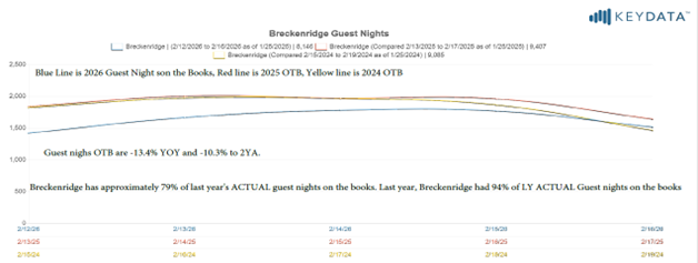 President’s Weekend (February 12 to Feb 16) has 13.4% fewer guest nights on the books than 2025. Breckenridge has booked approximately 79% of last year’s actual guest nights. Last year, on this date, Breckenridge had 94% of 2025 actual nights on the books. The graph below has 2 years of guest nights on the books plus last year’s actual guest nights on the books.