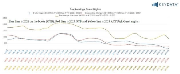 March 3 to April 12, 2026 has 1.5% fewer guest nights on the books than last year. Breckenridge has approximately 46% of historic actual guest nights on the books.
