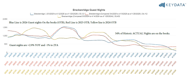 March 3 to April 12, 2026 has 2.9% fewer guest nights on the books than last year. Breckenridge has approximately 54% of historic actual guest nights on the books. Guest nights on the books are -1% to 2YA.