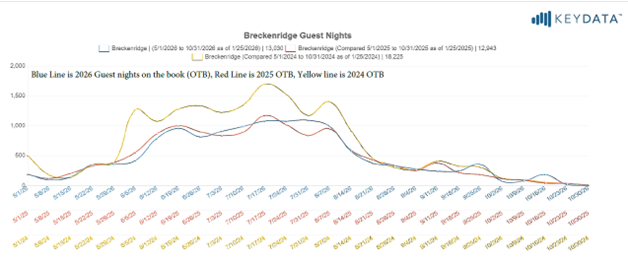 Breckenridge has approximately 83% of 2025 actual guest nights on the books for these dates. Last year, Breckenridge had 94% of 2025 actual guest nights on the books. The graph below compares 2026 nights OTB vs. 2025 nights OTB and 2025 actual nights on the books.